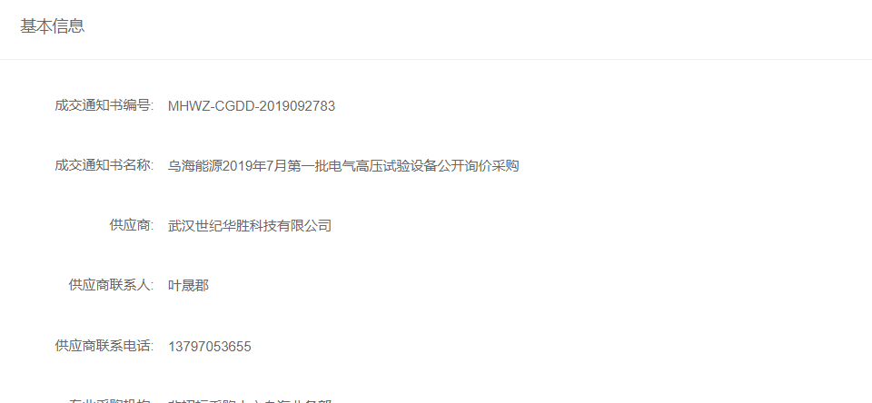 熱烈祝賀:武漢世紀(jì)華勝公司國家能源集團(tuán)烏海能源2019年7月第一批電氣高壓試驗(yàn)設(shè)備公開詢價(jià)采購中中標(biāo)