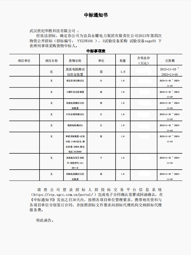 熱烈慶祝武漢世紀華勝科技有限公司在宜昌永耀電力集團有限責任公司2023年第四次物資公開招標項目中標